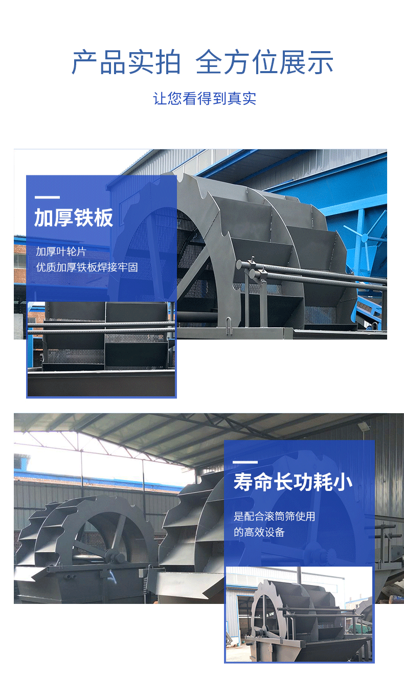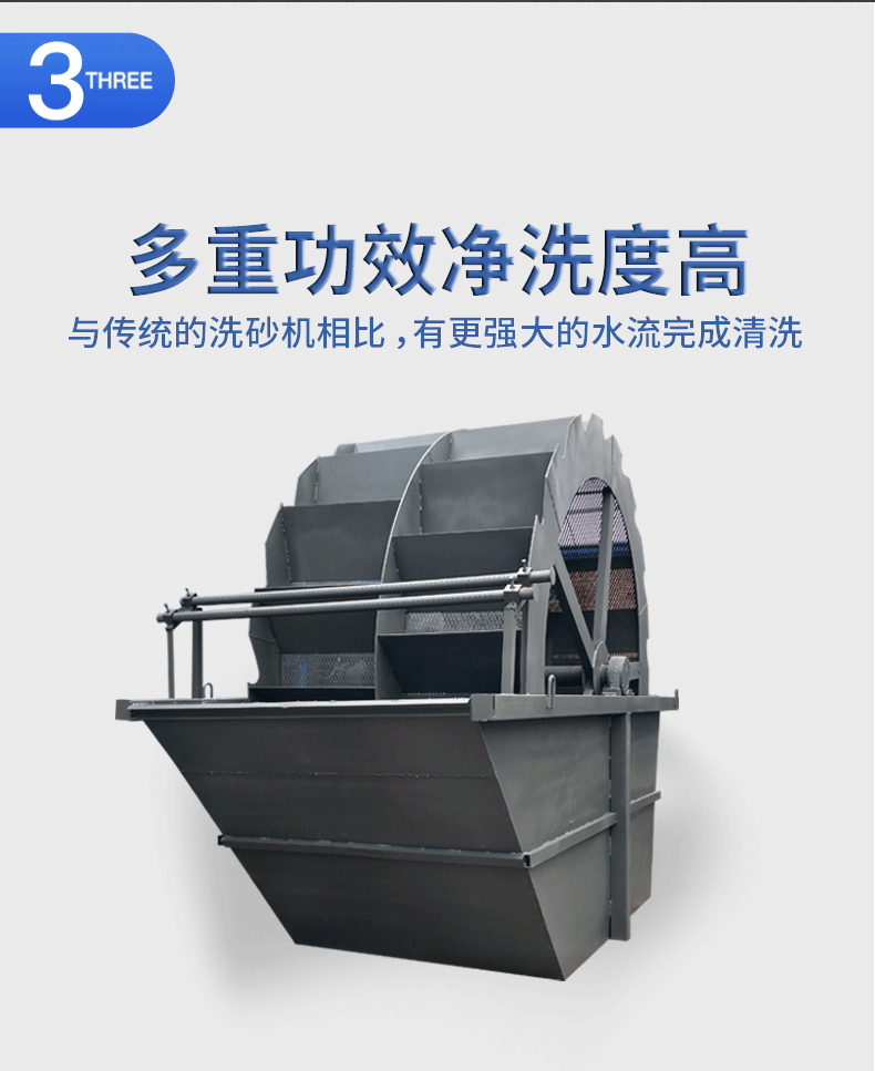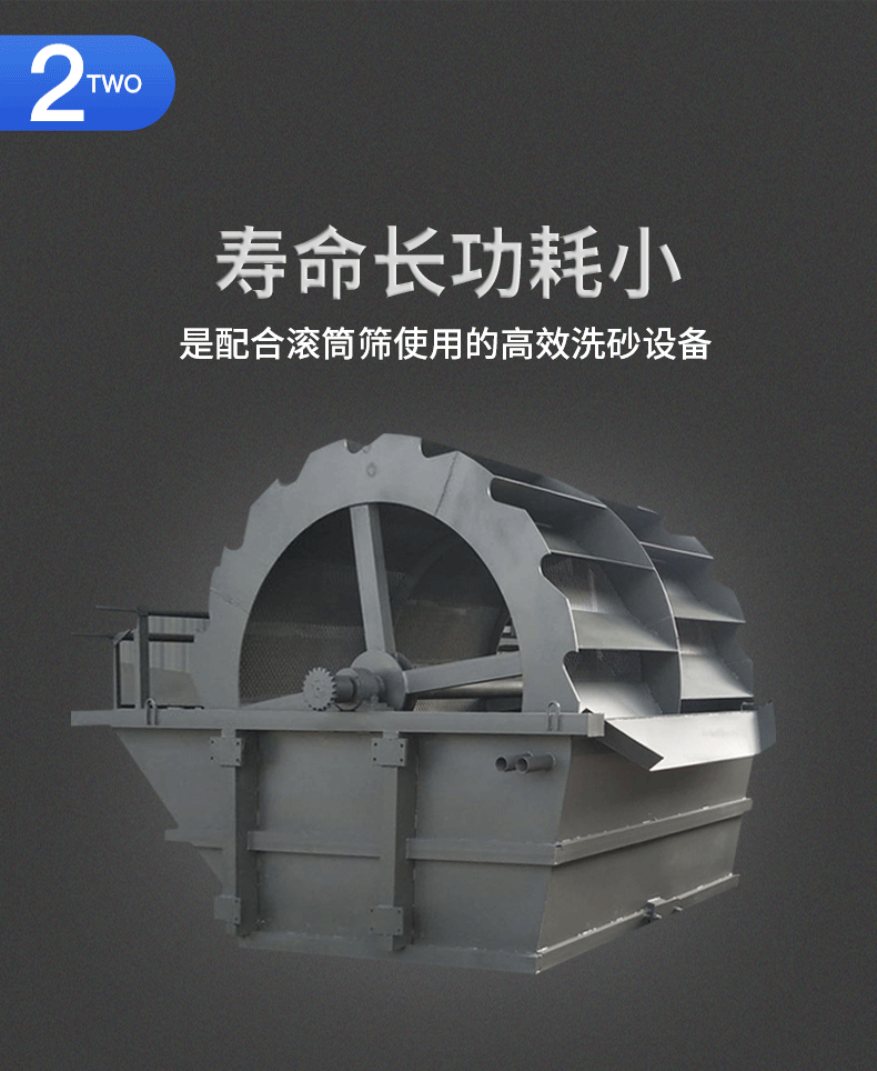 輪式洗砂機是洗砂機中常用、使用率較高的一種,是人工砂(包括天然沙)的洗選設(shè)備,該洗砂機廣泛應(yīng)用于建筑工地、砂石廠、水電站混凝土大壩工地等多種行業(yè)。該設(shè)備能除去覆蓋在砂石表面的雜質(zhì),同時破壞包覆砂粒的水汽層,以利于脫水,起到高效洗砂清洗作用。它具有洗凈度高,結(jié)構(gòu)合理,處理量大,功耗小,洗砂過程中砂子流失少,尤其是洗砂機傳動部分均與水、砂隔離,故其故障率大大低于目前常用洗砂機,是洗砂行業(yè)的優(yōu)秀選擇。