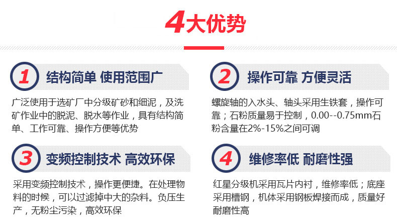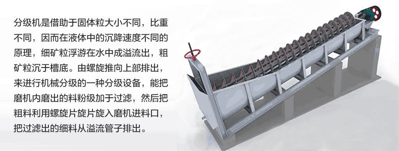 螺旋分級機是選礦的設(shè)備之一,螺旋分級機借助固體顆粒的比重不同,因而在液體中沉淀的速度不同的原理,進行機械分級的一種設(shè)備。螺旋分級機應(yīng)用于處理沖積砂礦,尤其適合于有用礦物單體解離度高而且呈扁平狀者。分級機主要有高堰式單螺旋和雙螺旋、沉沒式單螺旋和雙螺旋四種分級機。