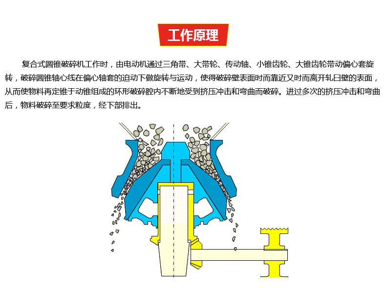復(fù)合式圓錐破碎機是基于層壓破碎原理和多破少磨概念設(shè)計研發(fā)的集高擺頻、優(yōu)化腔型和合理沖程于一體的高性能彈簧圓錐破。復(fù)合式圓錐破碎機之所以成為應(yīng)用廣泛的圓錐式破碎機,得益于其在各種工況環(huán)境下工作的可靠性,而CS系列極大程度上保留了其經(jīng)典結(jié)構(gòu),如彈簧保險裝置、大直徑主軸、重型機架和干油密封等,設(shè)備可靠性得到更大程度保證。多種腔型可供選擇,應(yīng)用多種工況條件。CS系列高效彈簧圓錐式破碎機有標(biāo)準(zhǔn)型和短頭型兩種機型,每種機型又配備多種腔型,可以適用于各種硬度物料的中碎和細碎作業(yè)需求。在大量的實踐應(yīng)用中顯示,CS系列高效彈簧圓錐破在用于中碎作業(yè)時性能尤為突出。