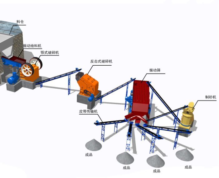 顎式破碎機+反擊式破碎機/圓錐破碎機+制砂機+(洗砂機)+振動給料機+圓振動篩+皮帶輸送機等